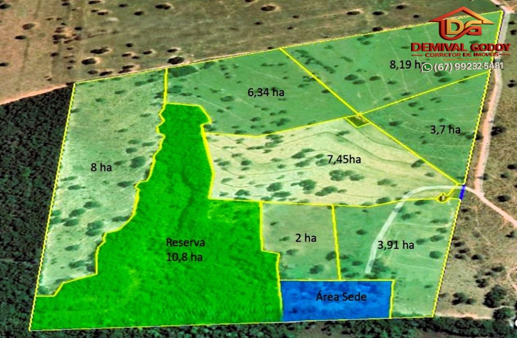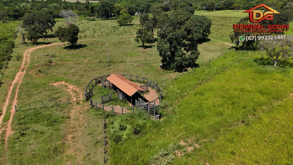 Propriedade rural 54 hectares totalmente plana com mangueiro completo, casa sede, dois acessos, sendo um de 22 km de estrada de terra antes de Rochedo e o outro de 11 km de estrada de terra com acesso por Corguinho, MS. Por Rochedo, fica apenas 91 km de Campo Grande, MS, e por Corguinho fica 101 km de Campo Grande. Poço artesiano na propriedade, sete divisões de pasto com piquetes. Propriedade rural completa e totalmente plana.