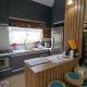 Sala ampla para 2 ambientes com integração perfeita à cozinha com armários